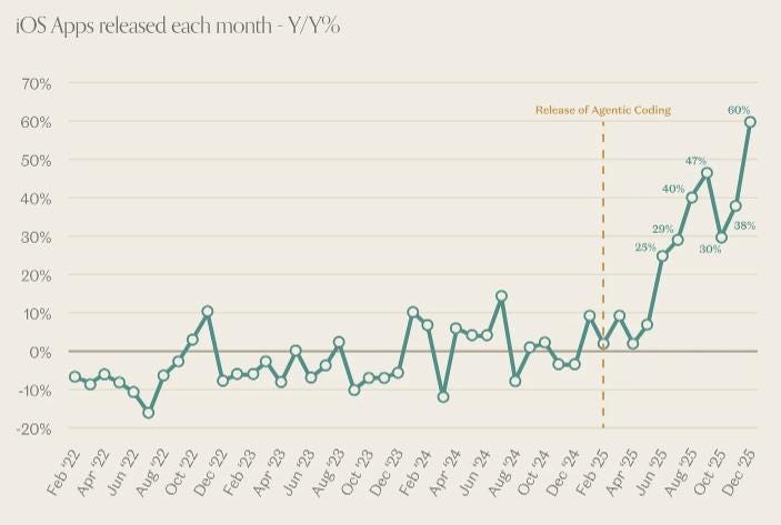 App releases had plateaued for years. Then agentic coding showed up in February 2025 and drove up to a 60% increase.
